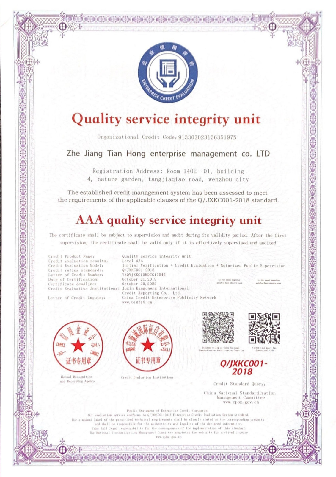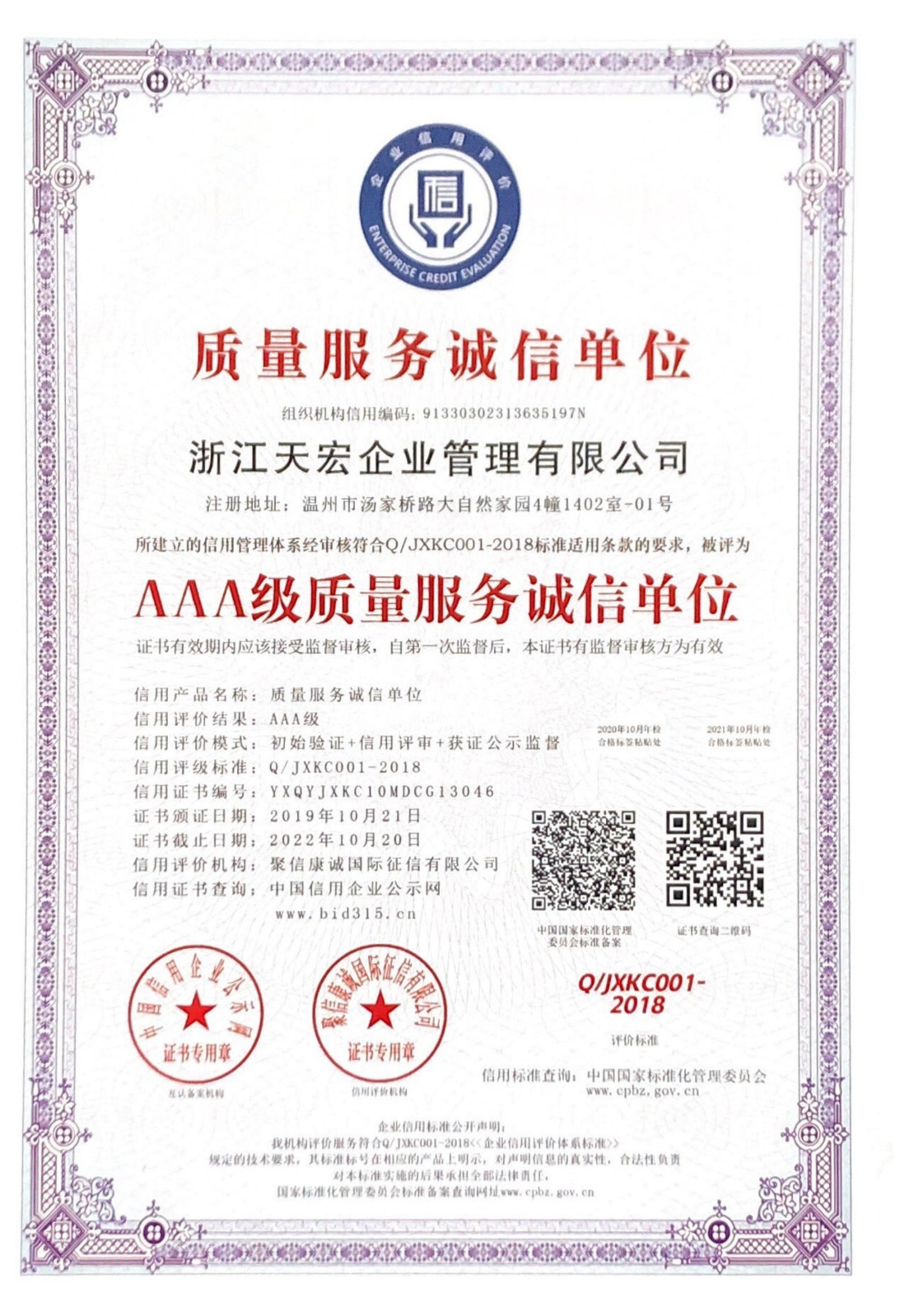 浙江天宏質(zhì)量服務(wù)AAA級(jí)證